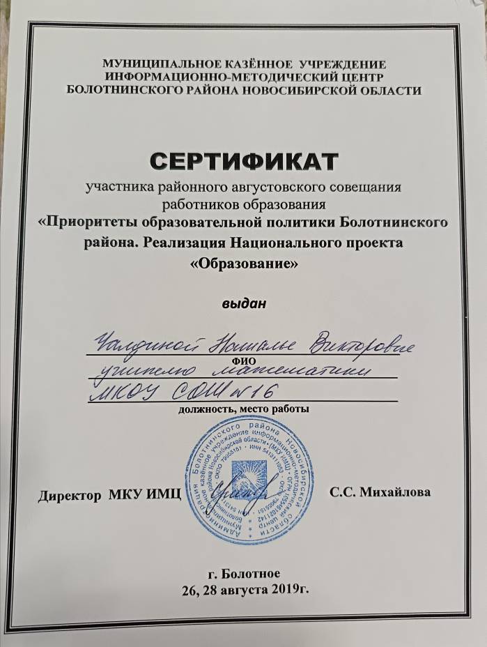 Сертификат "Приоритеты образовательной политики Болотнинского района. Реализация Национального проекта "Образование" 2019 г