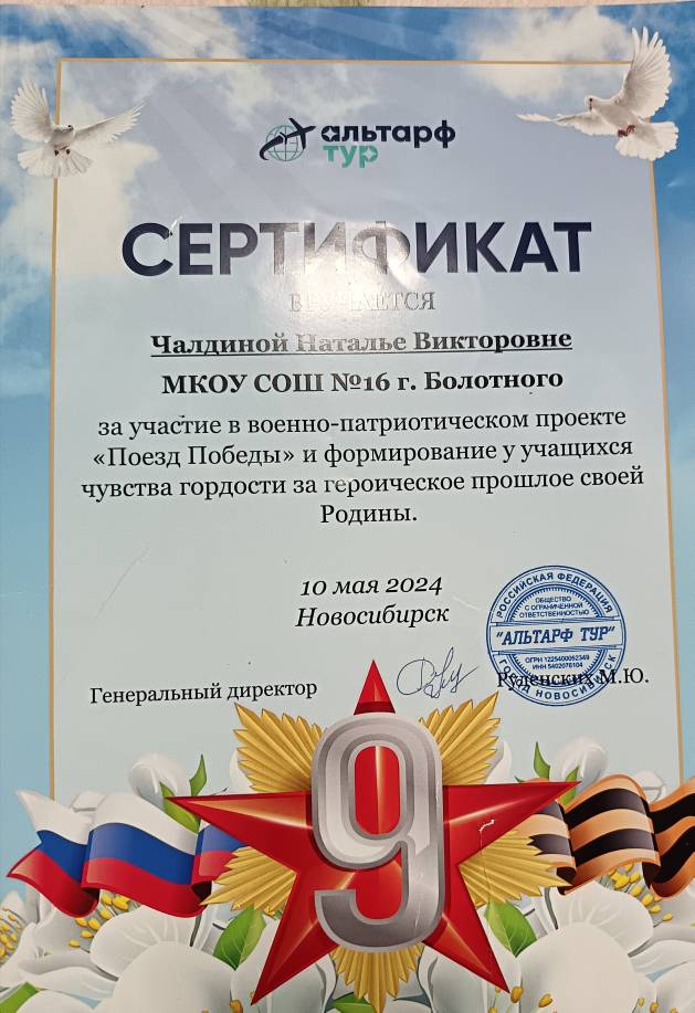 Сертификат за участие в военно-патриотическом проекте "Поезд Победы" 2024 г