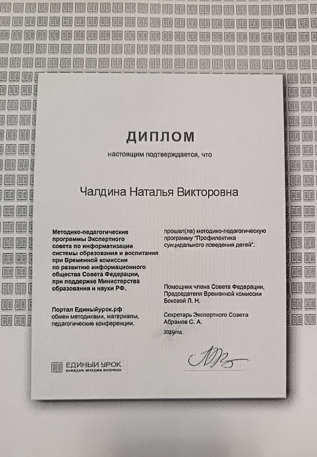 Удостоверение "Профилактика суицидального поведения детей" 2024 г