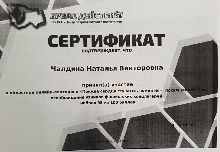 Сертификат за участие в онлайн-викторине "Знаю Новосибирскую область"