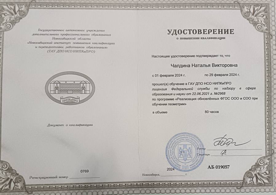 Удостоверение "Реализация обновленных ФГОС ООО и СОО при обучении геометрии" 2024