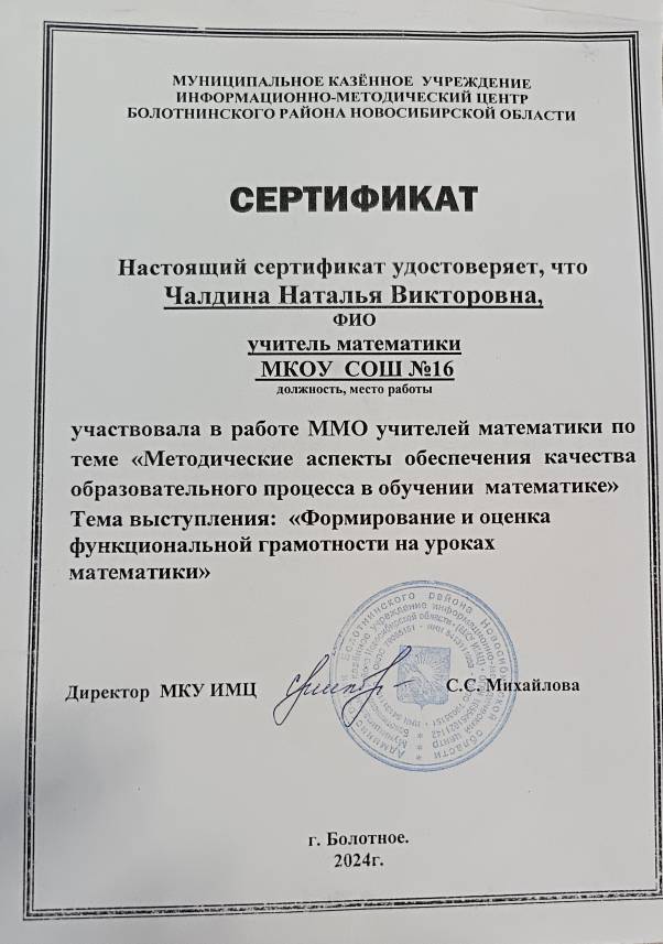 Сертификат " Формирование и оценка функциональной грамотности на уроках математики" 2024 г
