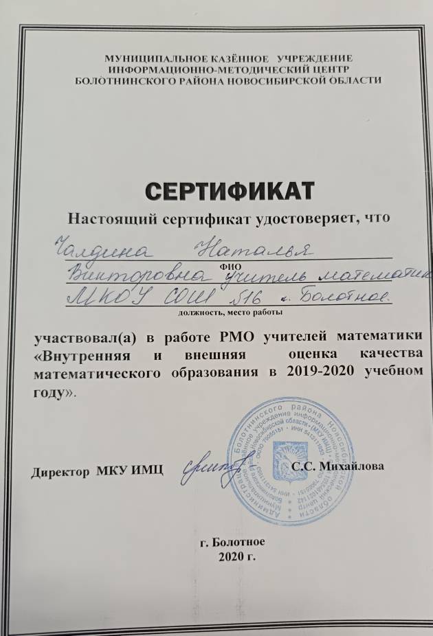 Сертификат "Внутренняя и внешняя оценка качества математического образования в 2019-2020 учебном году" 2020 г