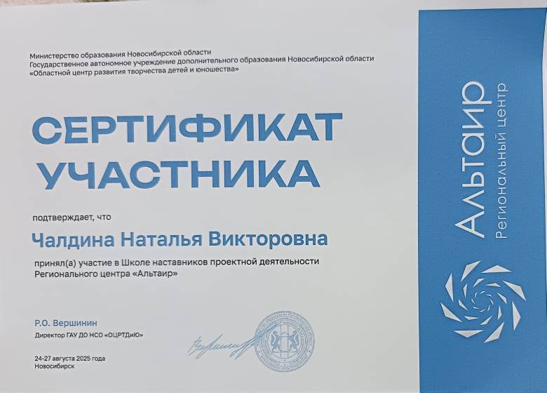 Сертификат участника в школе наставников проектной деятельности регионального центра "Альтаир" 2025 г