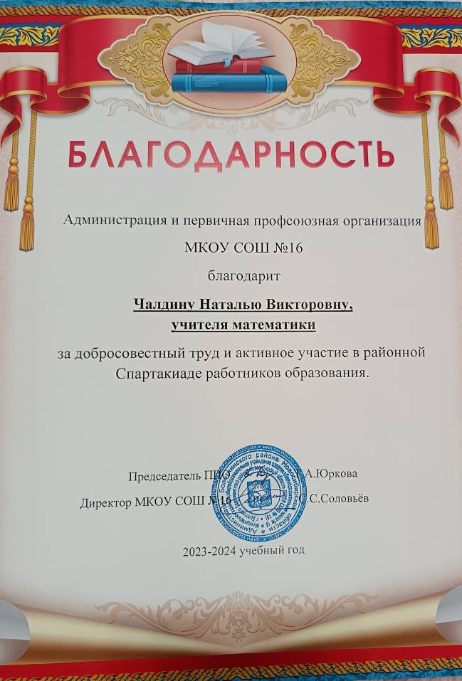 Благодарность за добросовестный труд и активное участие в районной Спартакиаде работников образования, 2023-2024