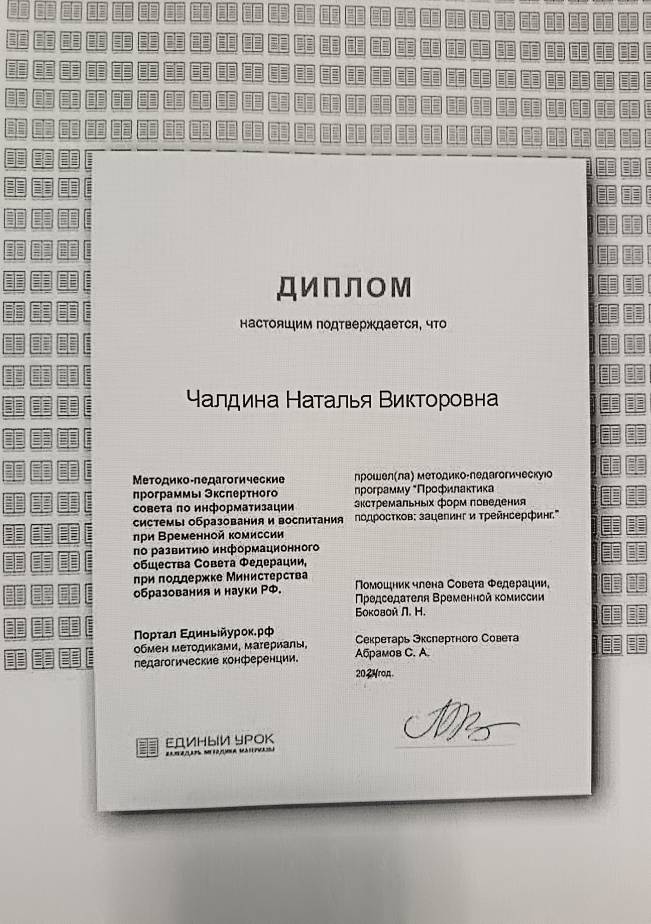 Удостоверение "Профилактика экстремальных форм поведения подростков: зацепинг и трейнсерфинг" 2024 г