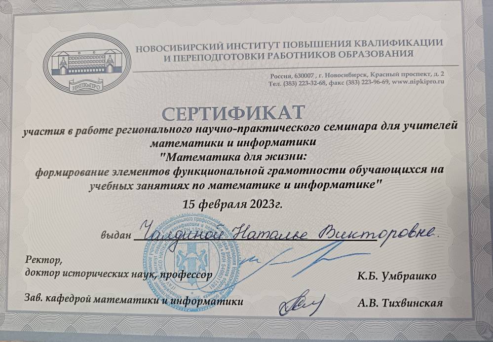 Сертификат "Математика для жизни: формирование элементов функциональной грамотности обучающихся на учебных занятиях по математике и информатике" 2023 г