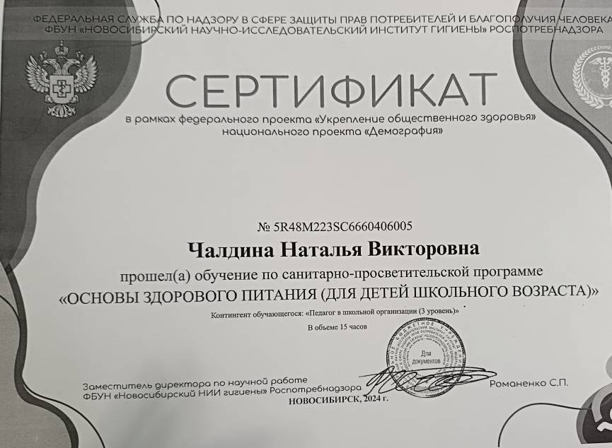 Сертификат "Основы здорового питания (для детей школьного возраста)"2024 г