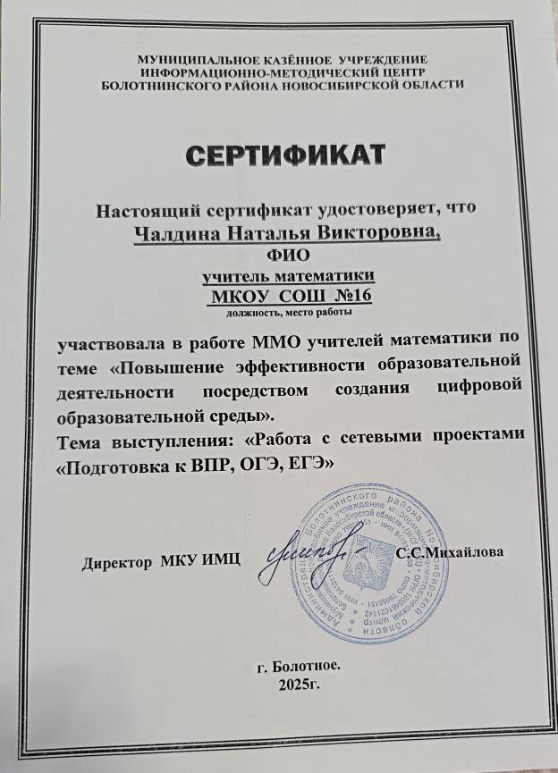 Сертификат "Повышение эффективности образовательной деятельности посредством создания цифровой образовательной среды" "Работа с сетевыми проектами "Подготовка к ОГЭ, ВПР, ЕГЭ" 2025 г