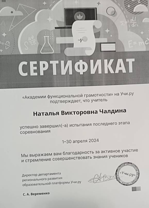 Сертификат "Академии функциональной грамотности" на учи ру, 2024 г