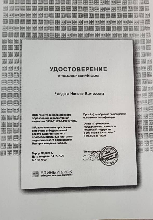 Удостоверение " Аспекты применения государственных символов Российской Федерации в обучении и воспитании" 2023 г