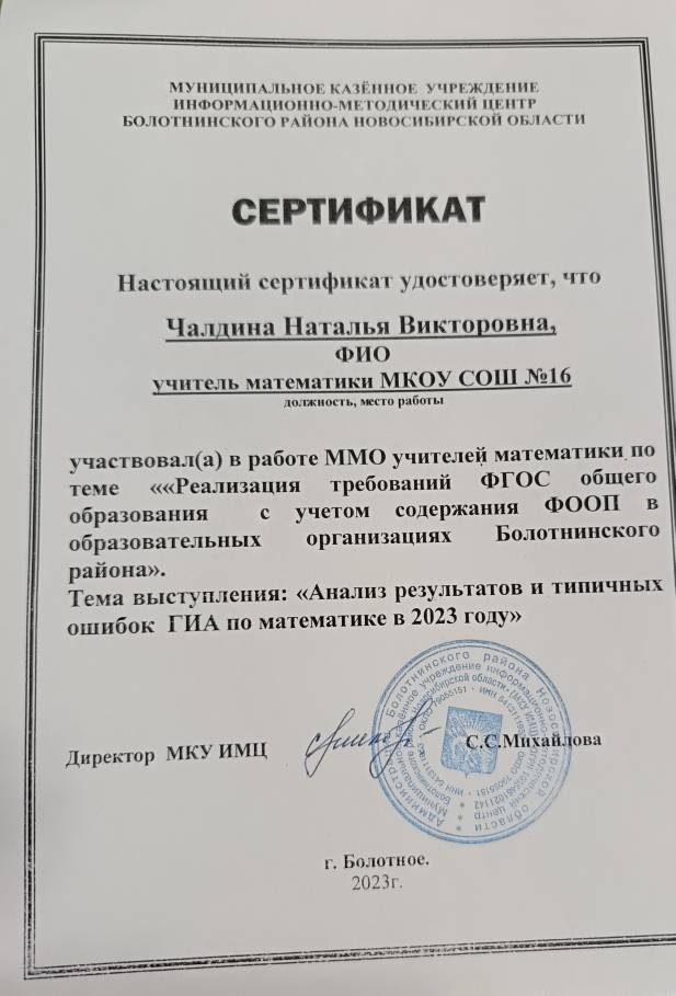 Сертификат " Анализ результатов и типичных ошибок ГИА по математике в 2023 году"